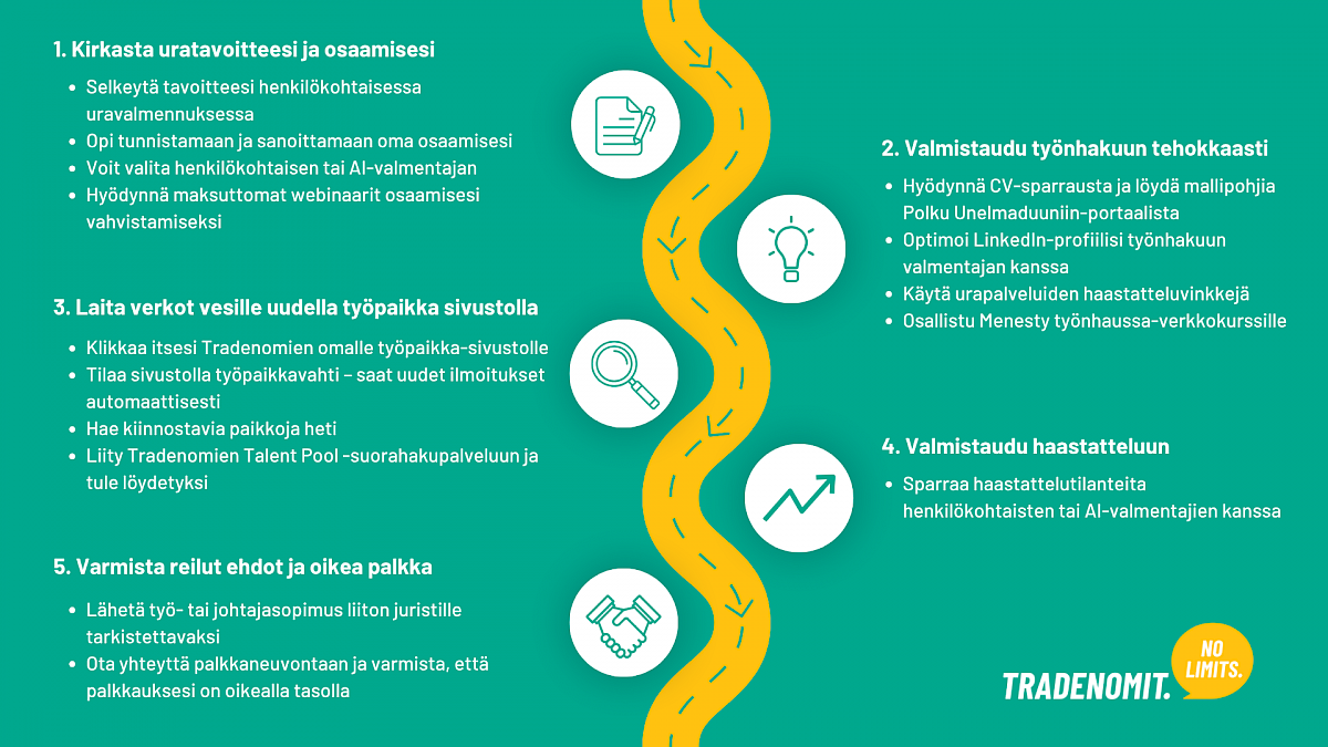 Liity Tradenomien LinkedIn-ryhmän. Siellä julkaistaan myös tradenomeille avoimia työpaikkoja.