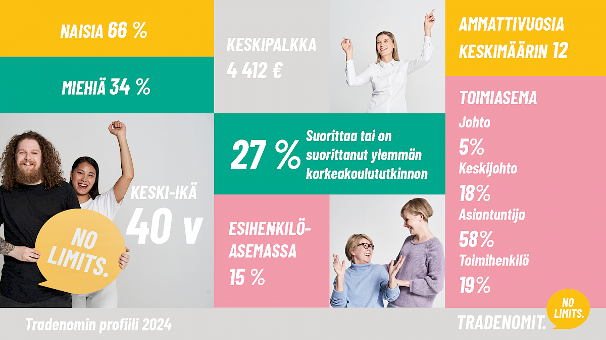Jäsentutkimuksemme mukaan 93 % tradenomeista on työ- tai virkasuhteessa. Vuonna 2023 vastaajista noin 2,5 % oli työttömänä tai lomautettuna. Yrittäjänä toimi noin 4 % tutkimukseemme vastanneista.